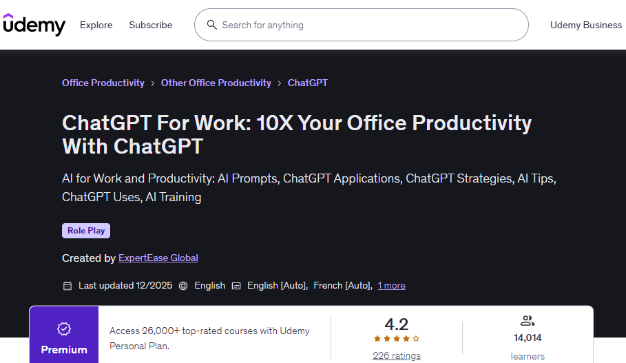 This Course includes: AI for Work and Productivity | AI Prompts | ChatGPT Applications| ChatGPT Strategies | AI Tips | ChatGPT Uses | AI Training